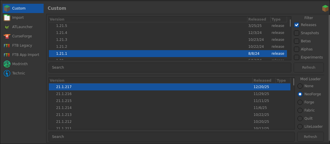 Select the Minecraft and Mod Loader versions that are needed for your modpack: