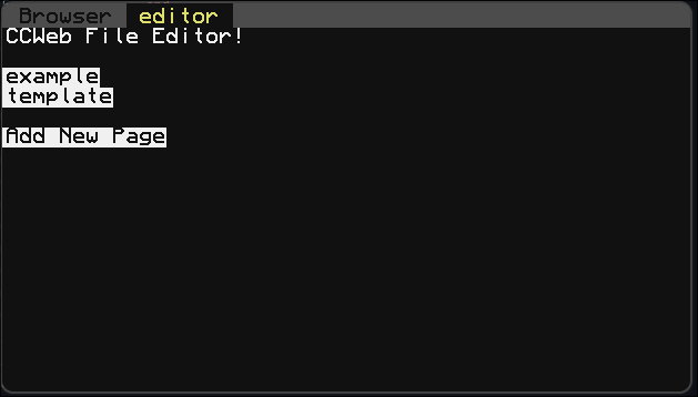 Open web.lua and click the Editor button or run editor.lua to view the built-in screen editor! Here, you can view all of the screens you have saved locally on your computer. You will see two by default: the example page which shows all of the available functions and a blank template.