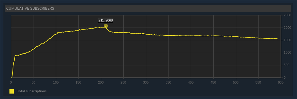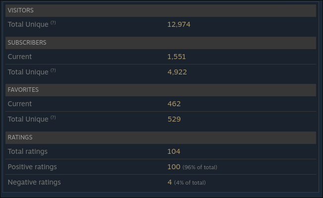 On launch the mod was an instant hit, gaining nearly 1,000 users in the first day! The mod eventually even reached a peak of over 2,000 active users and has achieved a 96% positive rating by users! In its lifetime, the mod has reached nearly 13,000 visitors on Steam, and nearly 5,000 unique subscribers.